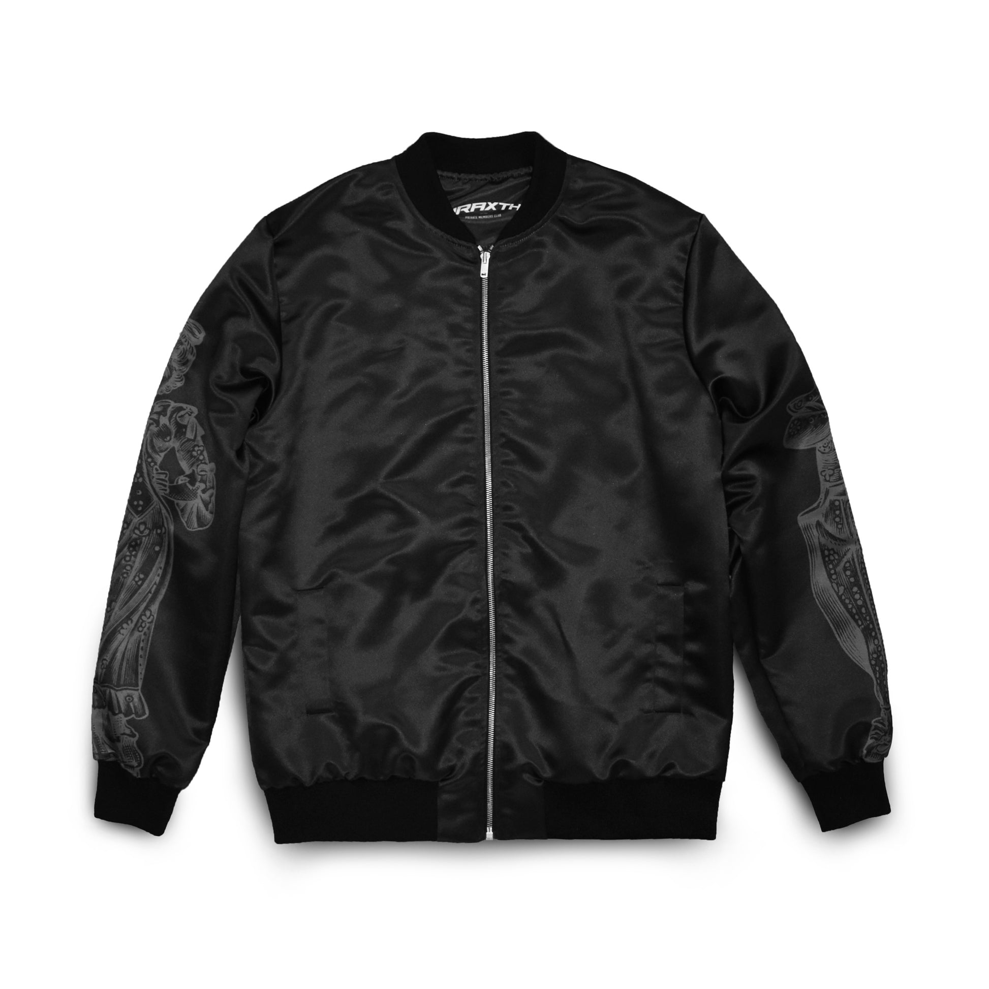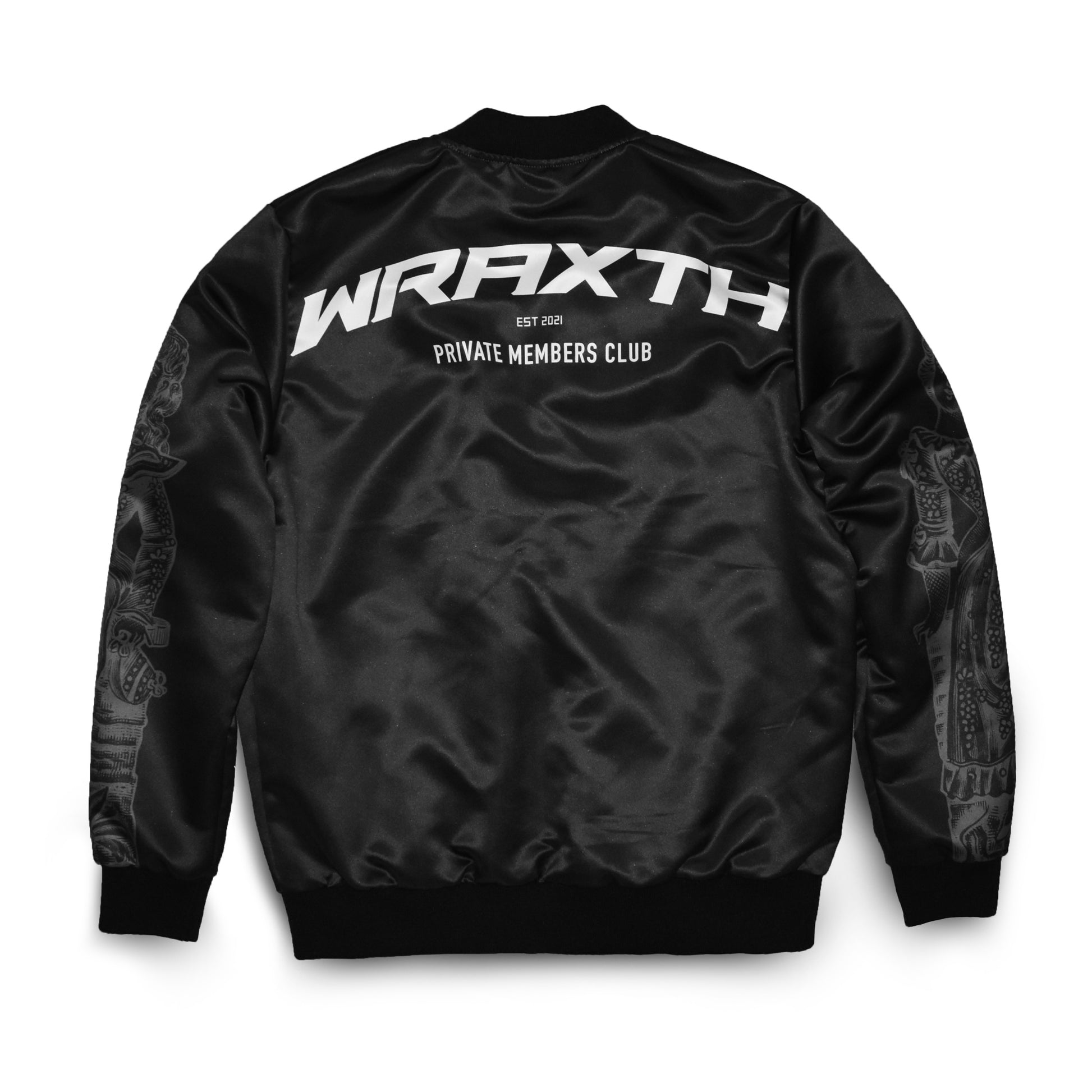 A luxury bomber jacket, the iconic WRAXTH Members Club piece featuring Princess Statue Motifs.