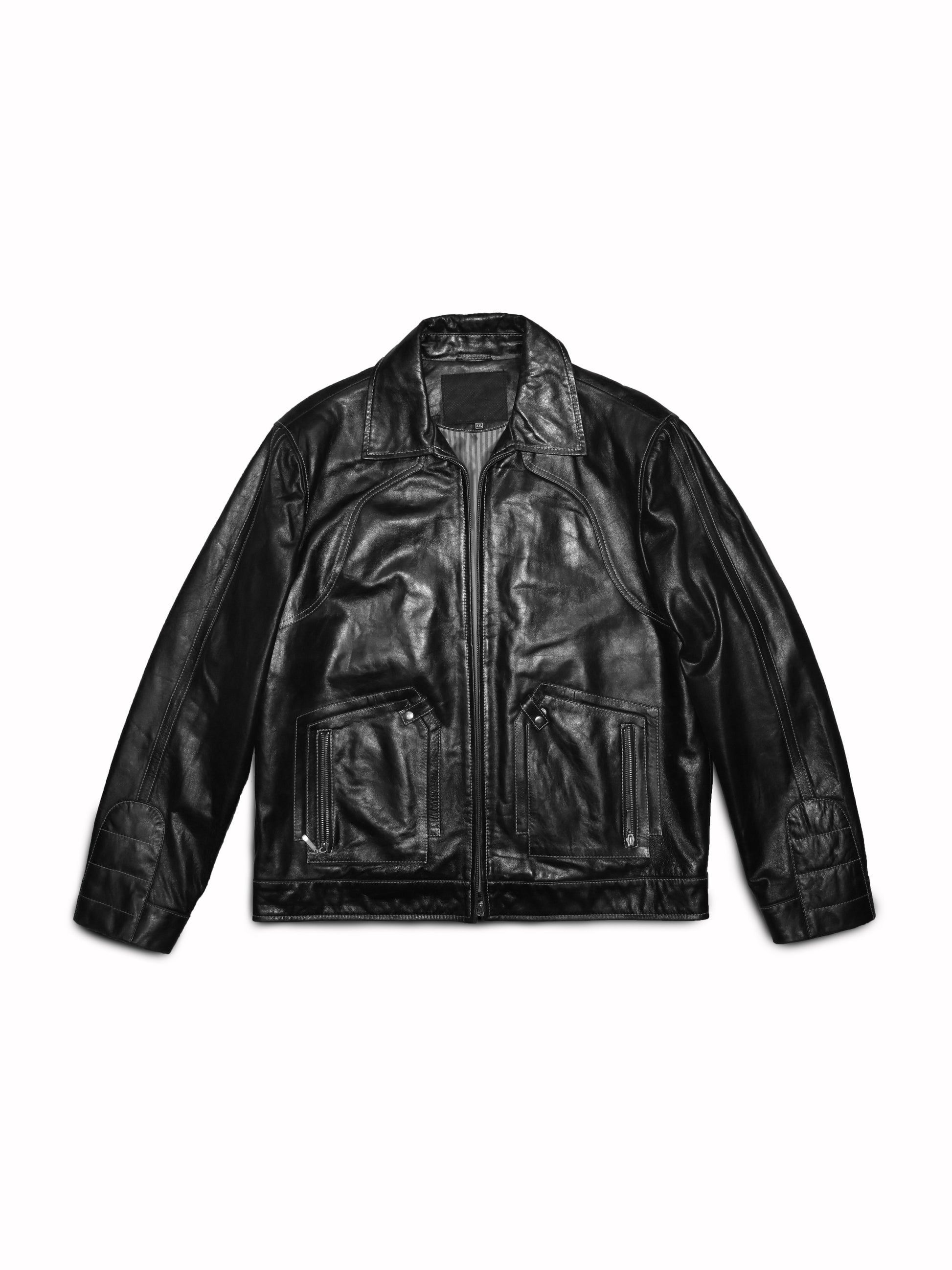 Heavyweight Leather Jacket with contrast white stitching and metal hardware.